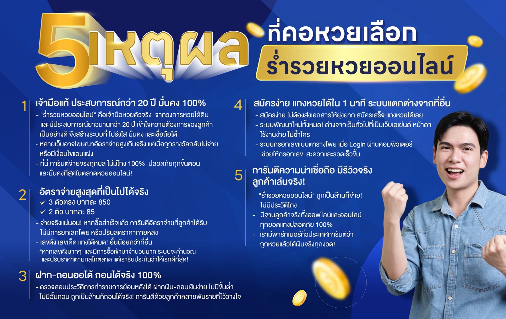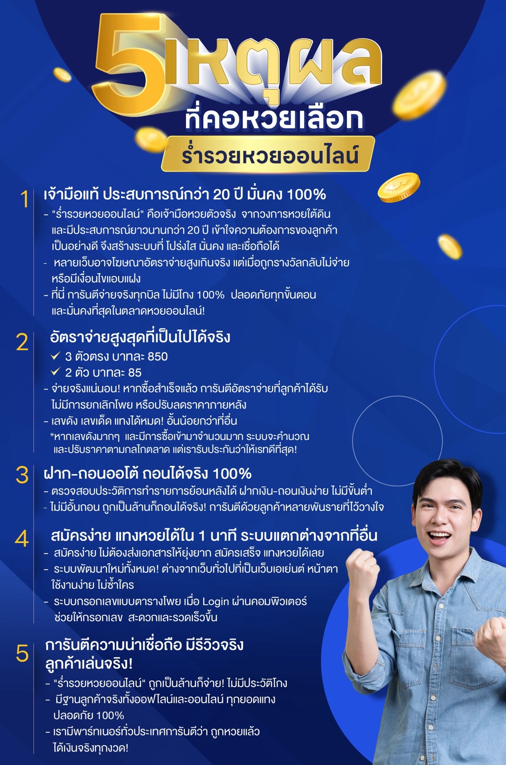 สัมผัสประสบการใหม่ ในการซื้อหวยออนไลน์กับเว็บที่มาแรงที่สุดในตอนนี้ ร่ำรวยหวยออนไลน์ พร้อมให้บริการหวยแบบครบวงจร คัดเฉพาะ หวยที่ออกผลจริงเท่านั้น เห็นเป็นที่ประจักต่อสายตา มั่นคง ปลอดภัย ตรวจสอบได้ อาทิเช่น หวยรัฐบาลไทย หวยลาว หวยฮานอย หวยมาเล หวยหุ้น ซื้อง่าย จ่ายจริง ปลอดภัยทุกบิล